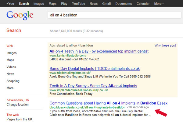 Take a look at the following clip taken  from page one of Google. Right at the top just under the paid ads is an entry for a blog post made on an active dental blog managed by Dental Media for one of their clients. This is a blog post made about a popular, up-coming dental implant technique and written in such a way that it is targeted for a specific location – in this case Basildon in Essex.